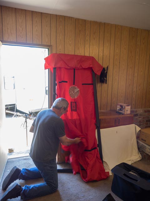 Our test was administered by Steve Mann of Home Energy Services. Steve is our Passive House and LEED certifier, energy adviser, and an important part of our team. Here is Steve attaching the door blower, which is literally a fan in a housing that is attached very snugly to a door.