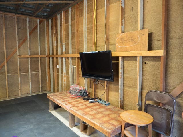 The white square where Andy is standing is a small door for going between the hangout space and the rest of the barn (there is also a regular sized exterior door in the hangout space, but its a long walk around to get back into the main barn area, and the small door also works as a second means of egress, since we are all about not getting trapped in case of emergency). The entire panel where Andy is standing can also be removed, so large items can be brought in and out of the space.